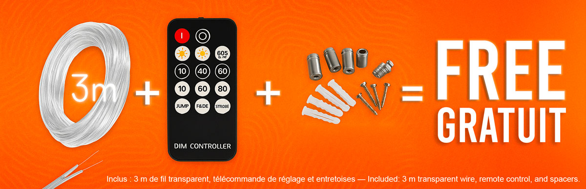Le configurateur offre une représentation très fidèle du résultat final. Un ou plusieurs câbles d'alimentation seront connectés à une prise unique. Nous fournissons environ 2 mètres de câble transparent. Par défaut, le câble d'alimentation est situé en bas à droite.